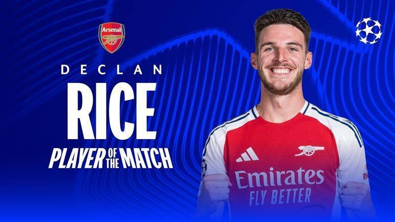 欧冠1/4决赛首回合,阿森纳主场3-0战胜皇马,赖斯任意球梅开二度,当选全场最佳球员。