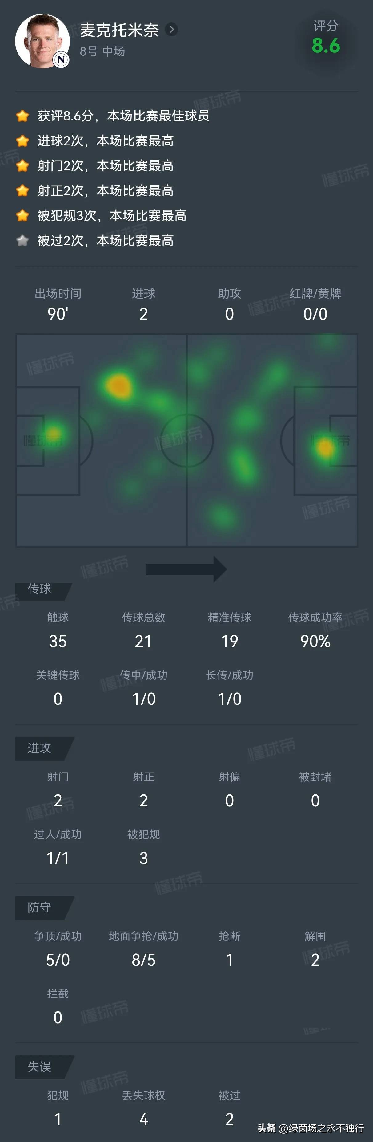 在赛后评分中,麦克托米奈毫无疑问地获得了全场最高评分,光荣加冕为本场比赛的最佳球员。他的活动热图和关键数据无不显示着他在场上的统治力。
